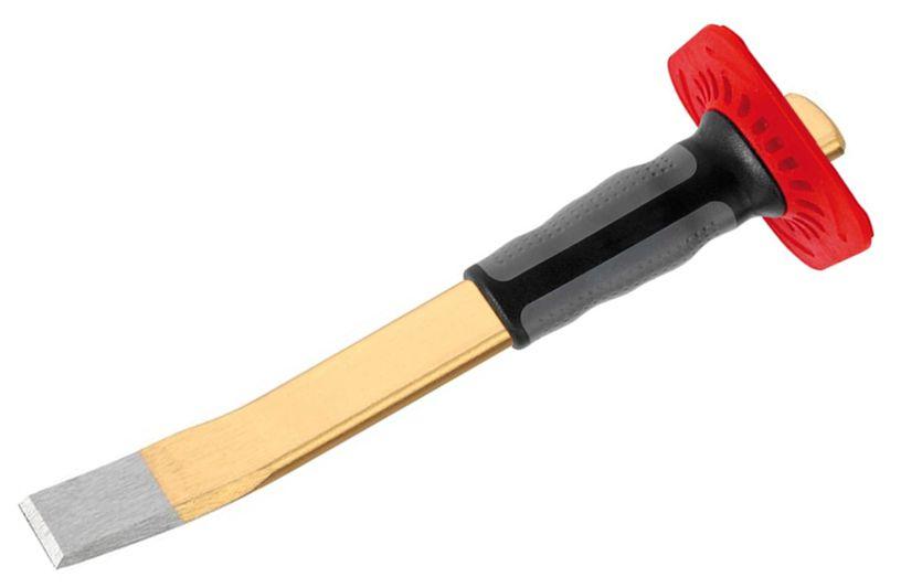 Burin coudé avec pare-coups 26 x 240 mmBurin coudé pour un travail à ras plus facile. En acier chrome vanadium finition peinture époxy dorée. Lame trempée polie avec un seul côté chanfreiné. Livré avec poignée pare-coups avec grip pour le confort et la sécurité. Fabrication Allemande.