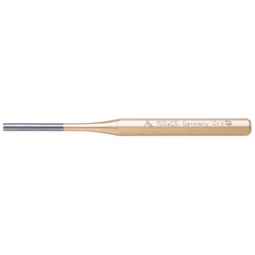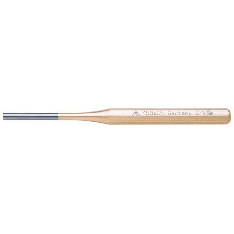Chasse-goupille en acier chrome vanadium finition peinture epoxy dorée. Corps hexagonal. Tête trempée polie.Diamètre : 5 mmLongueur : 150 mm