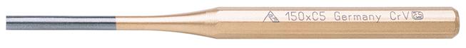 Chasse-goupille en acier chrome vanadium finition peinture epoxy dorée. Corps hexagonal. Tête trempée polie.Diamètre : 6 mmLongueur : 150 mm