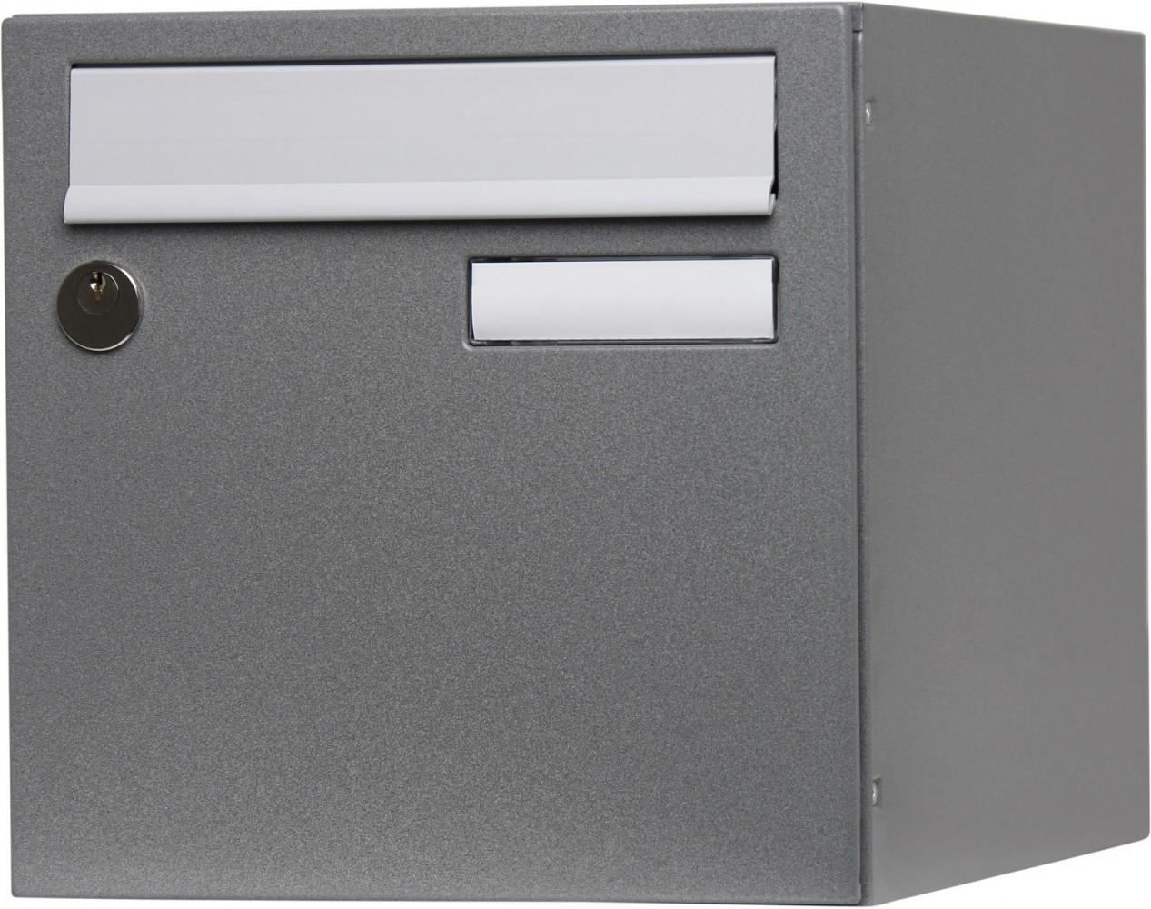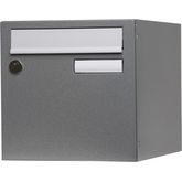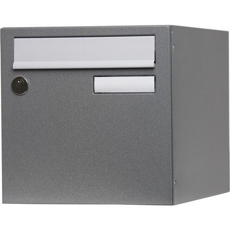 Boite aux lettres normalisée en acier revêtu métal garanti anti-corrosion 3 ans. Poudre polyester, gris moucheté. Anti‐vandale grade 2, arrachement supérieur à 15 kg. Livrée avec 1 clé. Boitier avec gouttière hydrofuge, porte recouvrante avec volet plastique équipée d'un porte‐nom affleurant en polycarbonate. 1 porte, dimensions : 285 x 285 x 385 mm.