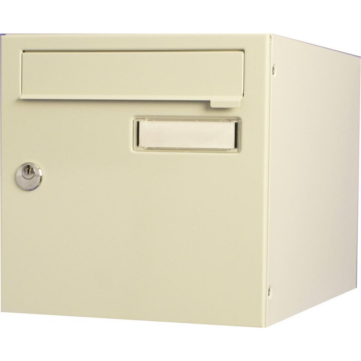 Boite aux lettres normalisée en acier revêtu métal. Poudre polyester, coloris beige, RAL 1001. Anti‐vandale grade 2, arrachement supérieur à 15 kg. Boitier avec gouttière hydrofuge, porte recouvrante avec volet en acier équipée d'un porte‐nom affleurant en polycarbonate. 2 portes, dimensions : 285 x 285 x 385 mm.