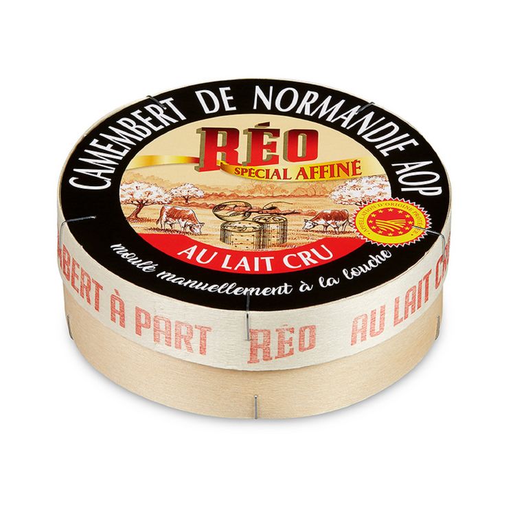 Puissance aromatique, texture généreuse, fleur fine, affiné sur mesure de blanc jusqu'à fait à cœur tels sont les qualificatifs qui symbolisent le camembert REO. Issu d'un lait cru collecté entre mer et bocage, qui lui confère une signature organoleptique à part. Le camembert REO est fabriqué encore aujourd'hui selon le savoir-faire développé par Théodore REAUX il y a plus de 80 ans.