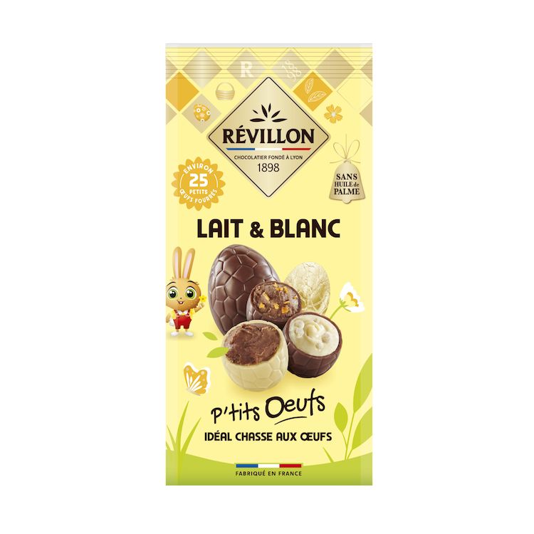 Découvrez les ptits œufs fourrés de Revillon ! Révillon a mis en œuvre tout son savoir faire chocolatier pour vous proposer ces délicieux petits œufs au chocolat blanc et chocolat au lait fourrés. Emballés individuellement, ils sont parfaits pour la chasse aux œufs des petits et des grands enfants!
