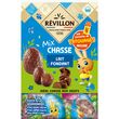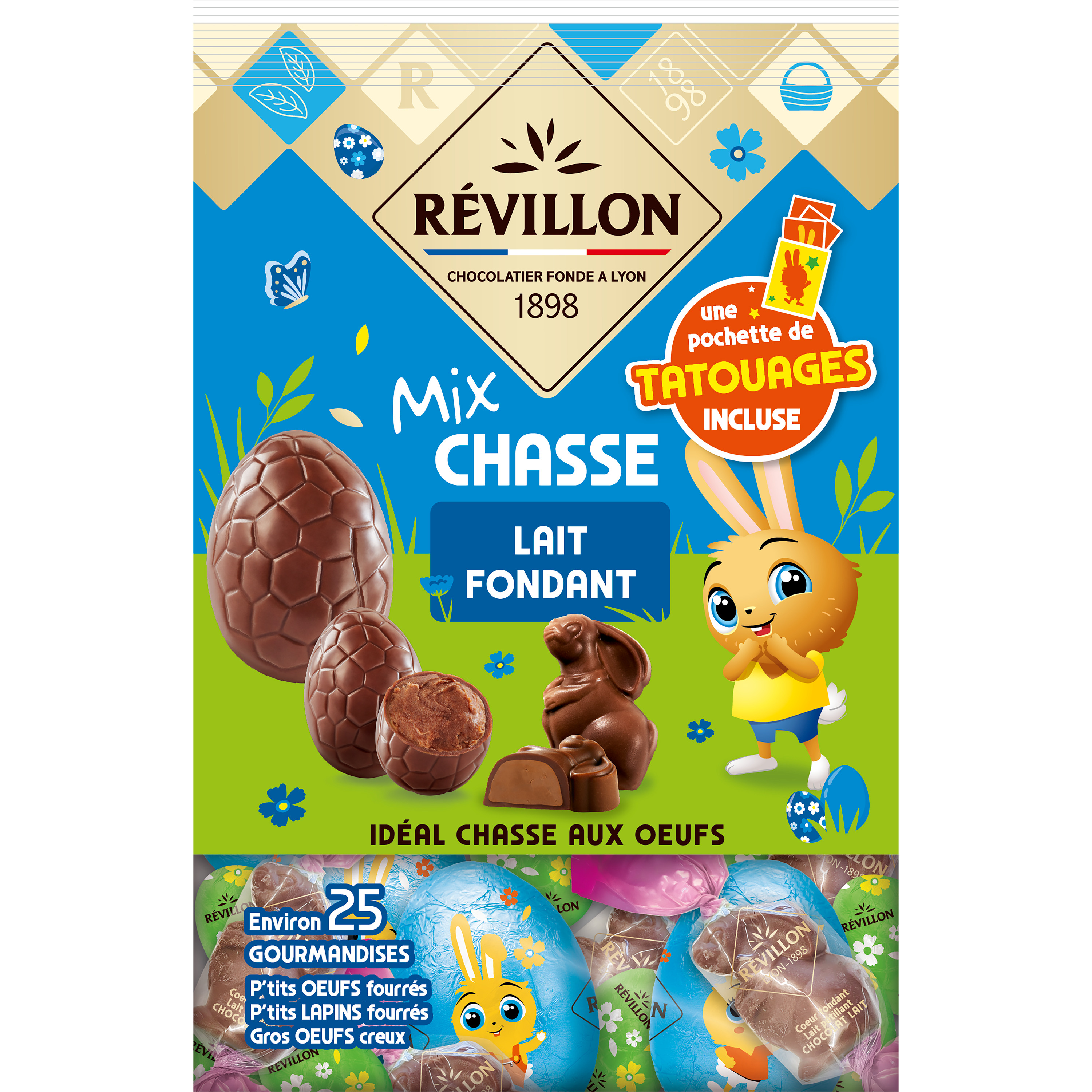 Révillon a mis en œuvre tout son savoir faire chocolatier pour vous proposer un assortiment de chocolats variés, idéal pour la chasse aux œufs des petits et des grands enfants ! Découvrez le Mix Chasse lait fondant avec des gros œufs creux au chocolat au lait, des petits œufs fourrés d'un cœur au praliné et des petits lapins fourrés d'un cœur fondant lait pétillant Et pour rendre la chasse aux œufs encore plus éclatante, une surprise se cache à l'intérieur du sachet!