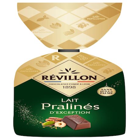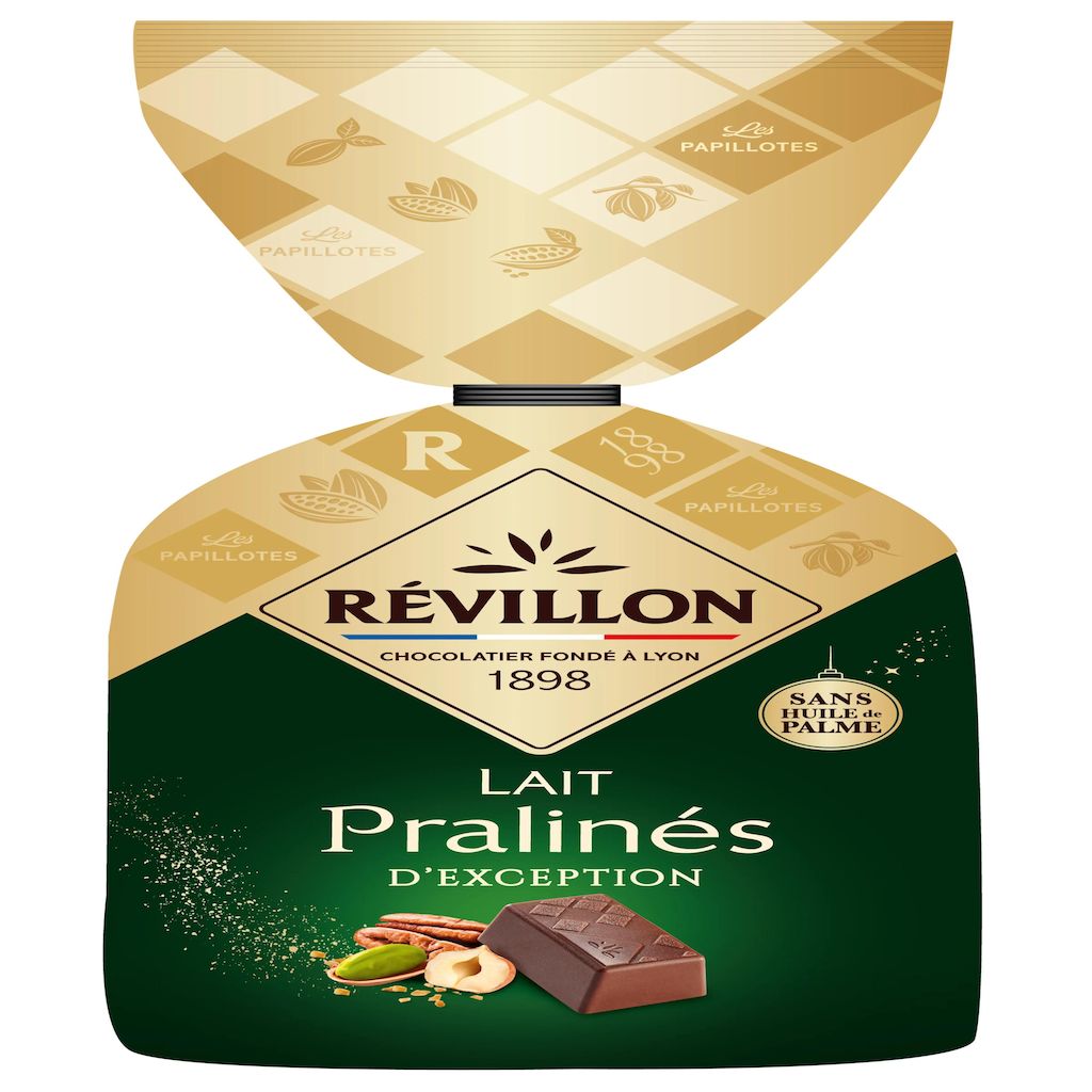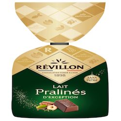 Dégustez des Pralinés d'Exception associés à la douceur d'un chocolat au lait. Des recettes raffinées imaginées par les chocolatiers Révillon qui ont mis tout leur savoir-faire et leur connaissance des ingrédients dans des chocolats gourmands invitant à la découverte de mariages de saveurs. Une expérience premium enrichie par les messages qui accompagnent la dégustation de ces papillotes.