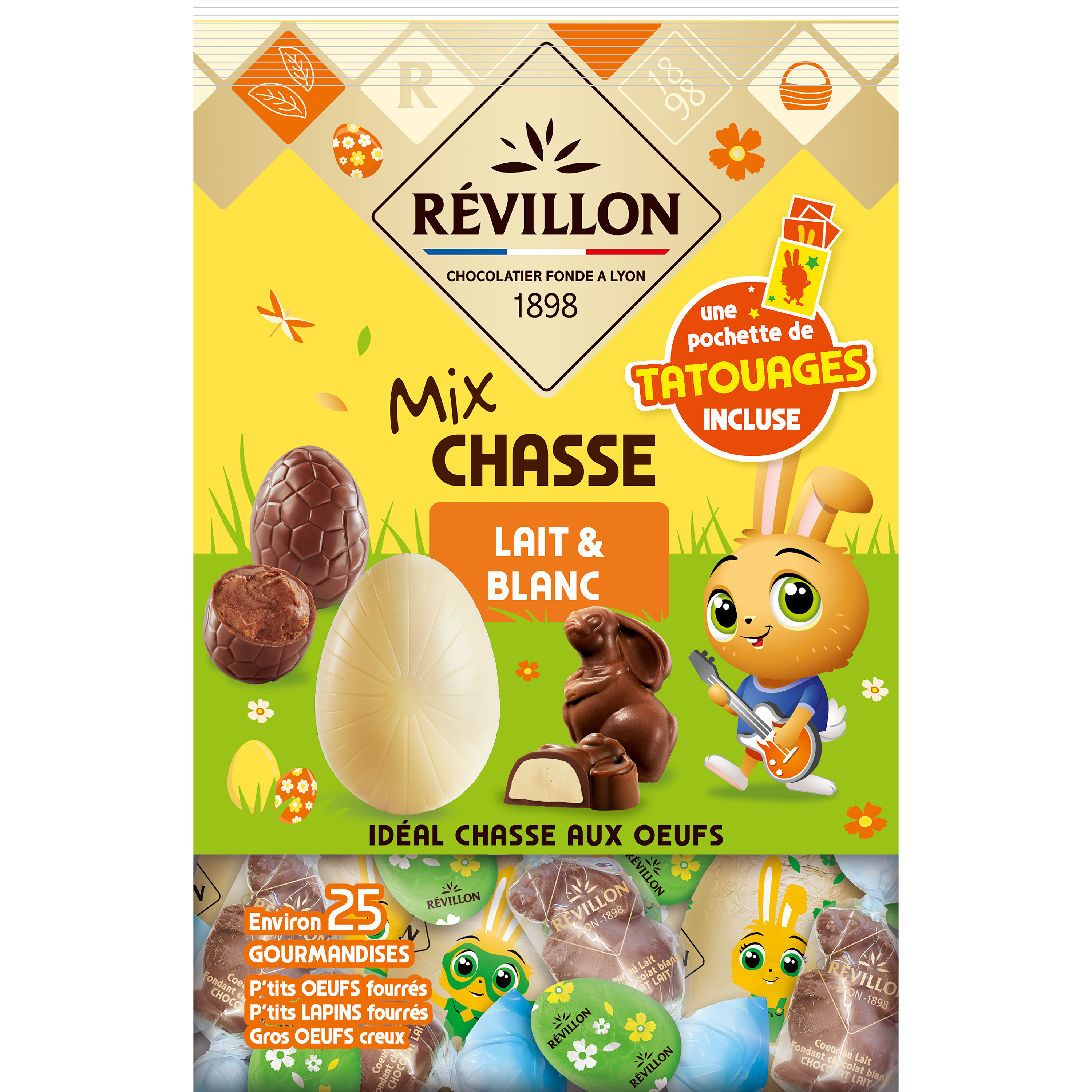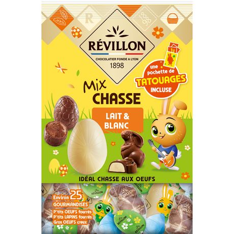 Révillon a mis en œuvre tout son savoir faire chocolatier pour vous proposer un assortiment de chocolats variés, idéal pour la chasse aux œufs des petits et des grands enfants ! Découvrez le Mix Chasse lait et blanc avec des gros œufs creux au chocolat blanc, des petits œufs au chocolat au lait fourrés d'un cœur au praliné et des petits lapins au chocolat au lait fourrés d'un cœur fondant blanc. Et pour rendre la chasse aux œufs encore plus éclatante, une surprise se cache à l'intérieur du sachet!