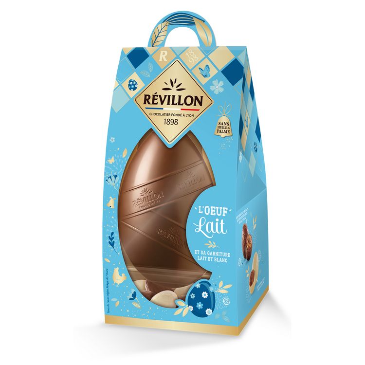 Moulage chocolat au lait et assortiment de bonbons de chocolat Révillon Chocolatier enchanteur depuis 1898, a créé cet œuf iconique en chocolat au lait accompagné de ses petits œufs fourrés. Généreux et gourmand, il est idéal à offrir et à partager en famille à la fin du repas de Pâques.