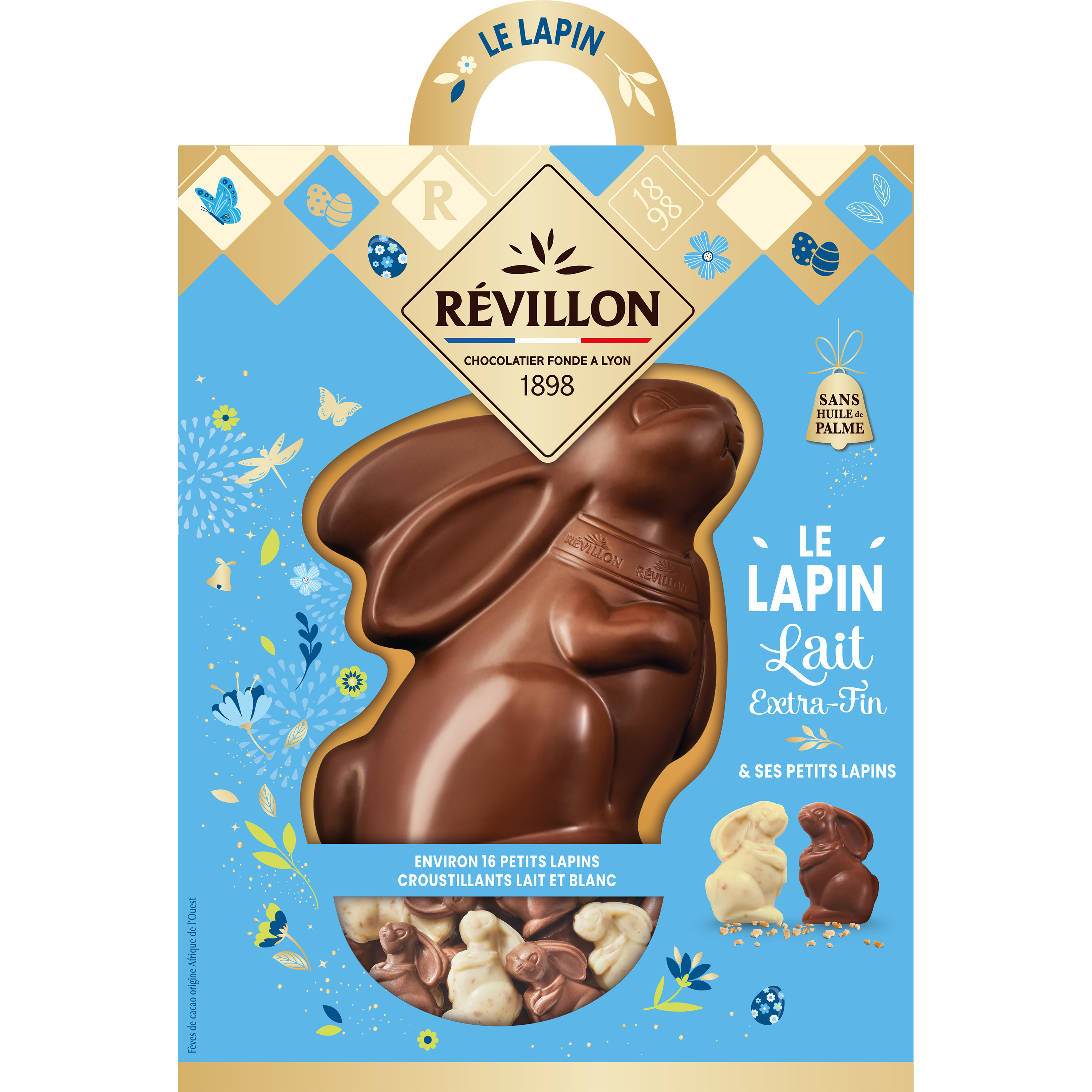 Révillon Chocolatier, enchanteur depuis 1898, a créé cet adorable Lapin en chocolat au lait, accompagné de ses petits lapins croustillants au chocolat au lait et blanc. Généreux, gourmand et sans huile de Palme il est idéal à offrir et à partager en famille à la fin du repas de Pâques.