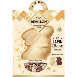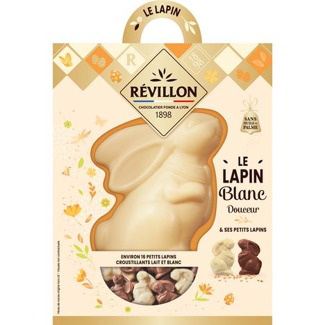 Révillon Chocolatier, enchanteur depuis 1898, a créé cet adorable Lapin en chocolat blanc, accompagné de ses petits lapins croustillants au chocolat aulait et blanc. Généreux, gourmand et sans huile de Palme il est idéal à offrir et à partager en famille à la fin du repas de Pâques