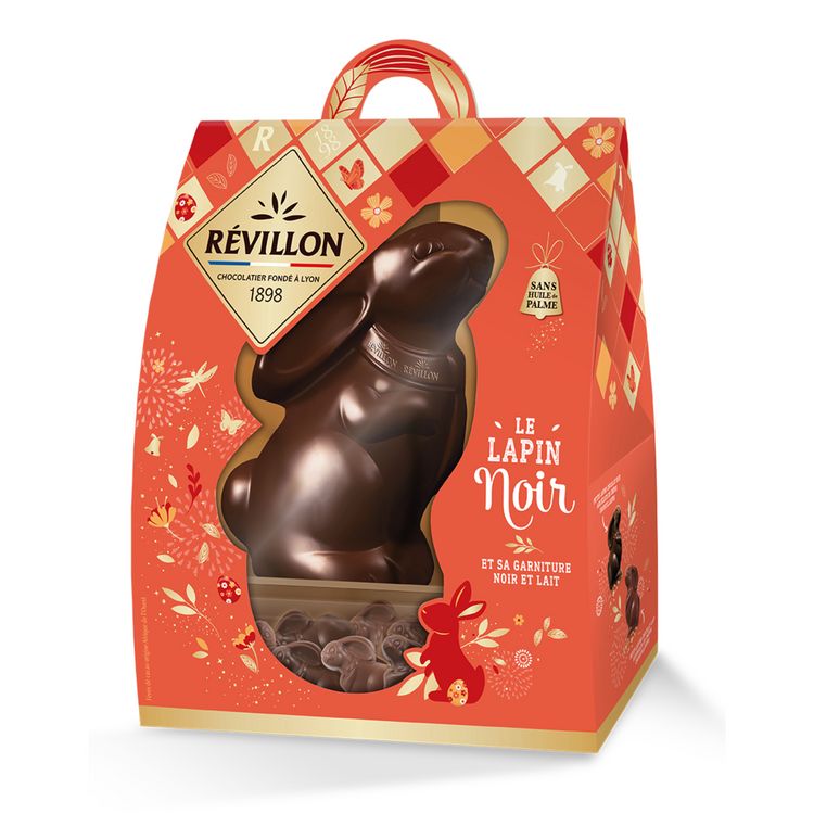 Passez de Joyeuses Pâques en dégustant en famille ce Lapin en chocolat noir intense, accompagné d'une tribu de petits lapins croustillants. Purs beurre de cacao et 100% fabriqués en France, ils sont le fruit de 120 ans de savoir-faire des chocolatiers Révillon. Moulage chocolat noir et assortiment de fritures chocolat lait et noir aux éclats de crêpe croustillante