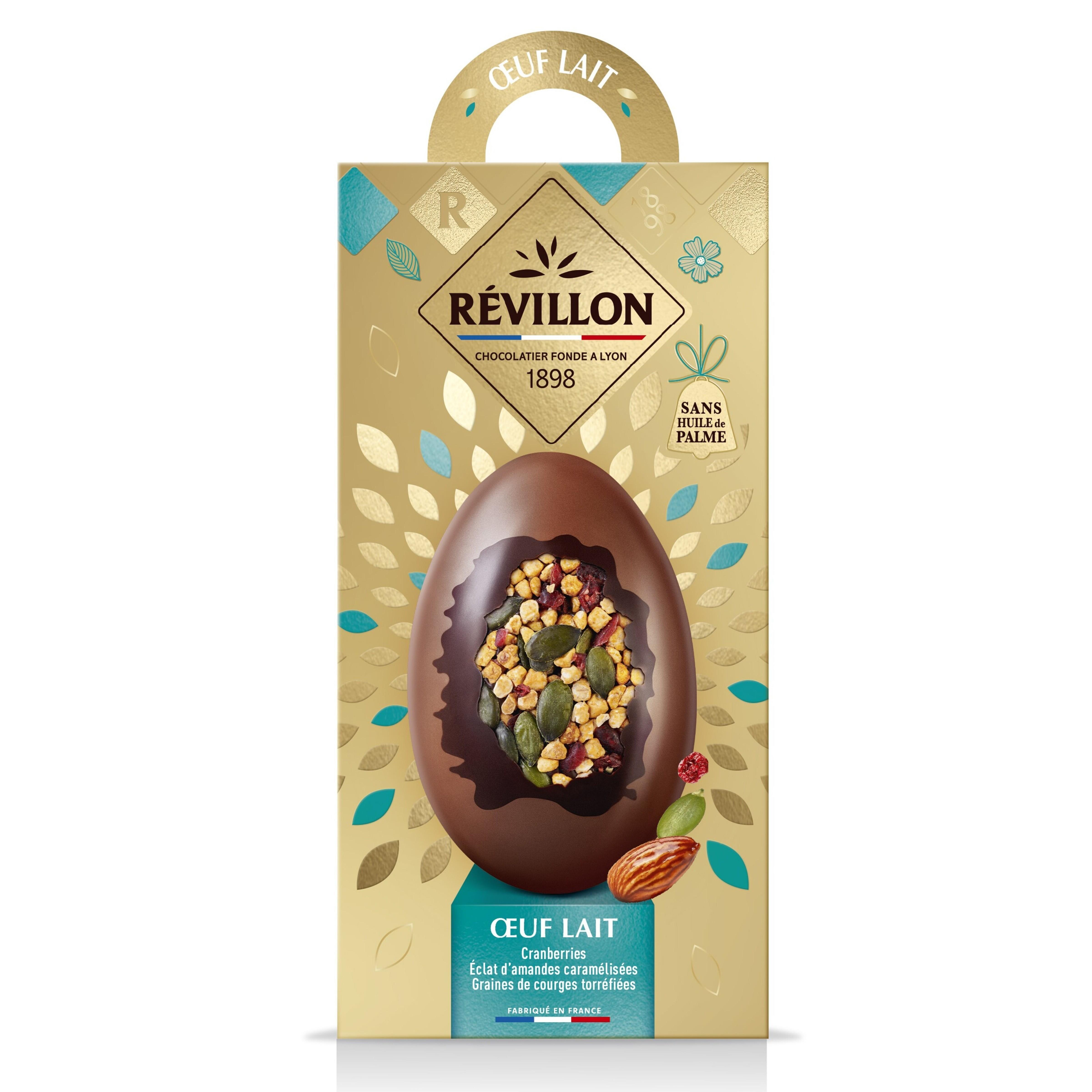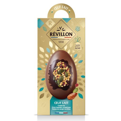 Révillon Chocolatier, enchanteur depuis 1898, a créé cet oeuf d'exception célébrant le savoir-faire chocolatier. Découvrez un mariage de saveurs où le fondant du chocolat au lait rencontre le croquant des éclats d'amandes caramélisées, des graines de courges et le moelleux des cranberries, pour une expérience gustative unique. Généreux, gourmand et sans huile de Palme il est parfait pour offrir ou se faire plaisir.