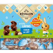 Découvrez les p'tits lapins fourrés de Revillon! Révillon a mis en œuvre tout son savoir faire chocolatier pour vous proposer ces petits lapins fourrés d'un cœur fondant blanc. Emballés individuellement; Ils sont parfaits pour la chasse aux œufs des petits et des grands enfants! Et pour rendre la chasse aux œufs encore plus éclatante, une surprise se cache à l'intérieur du sachet!
