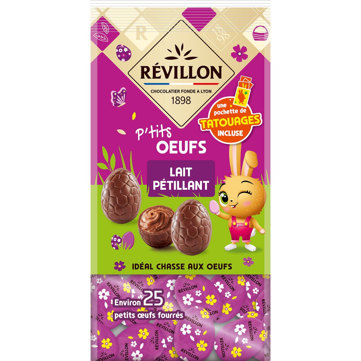 Découvrez les ptits œufs fourrés de Revillon ! Révillon a mis en œuvre tout son savoir faire chocolatier pour vous proposer ces délicieux petits œufs fourrés avec un cœur fondant lait pétillant. Emballés individuellement, ils sont parfaits pour la chasse aux œufs des petits et des grands enfants!