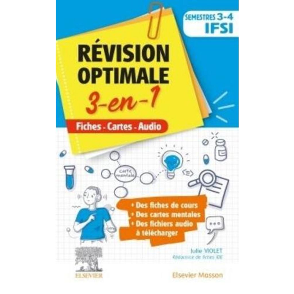 Cet ouvrage vous propose des révisions à la carte grâce à 3 supports à moduler entre eux en fonction de vos besoins : 180 fiches de révision proposent une synthèse linéaire des cours des semestres 3 et 4 et vous permettent de maîtriser toutes les connaissances des UE au programme , 171 cartes mentales reprennent de manière visuelle les fiches de cours et favorisent un apprentissage rapide et ludique , 171 fichiers audio permettent d'écouter la totalité des fiches et de réviser à tout moment et en tous lieux. Cet ouvrage, 3-en-1, vous permet donc de réviser selon vos préférences d'apprentissage : soit en favorisant la mémorisation visuelle de façon traditionnelle grâce aux fiches et de manière plus ludique grâce aux cartes mentales , soit en favorisant la mémorisation auditive grâce à l'écoute des pistes audio. Innovant, complet et pratique, cet ouvrage est le compagnon indispensable de vos révisions pour réussir les semestres 3 et 4 de vos études infirmières.