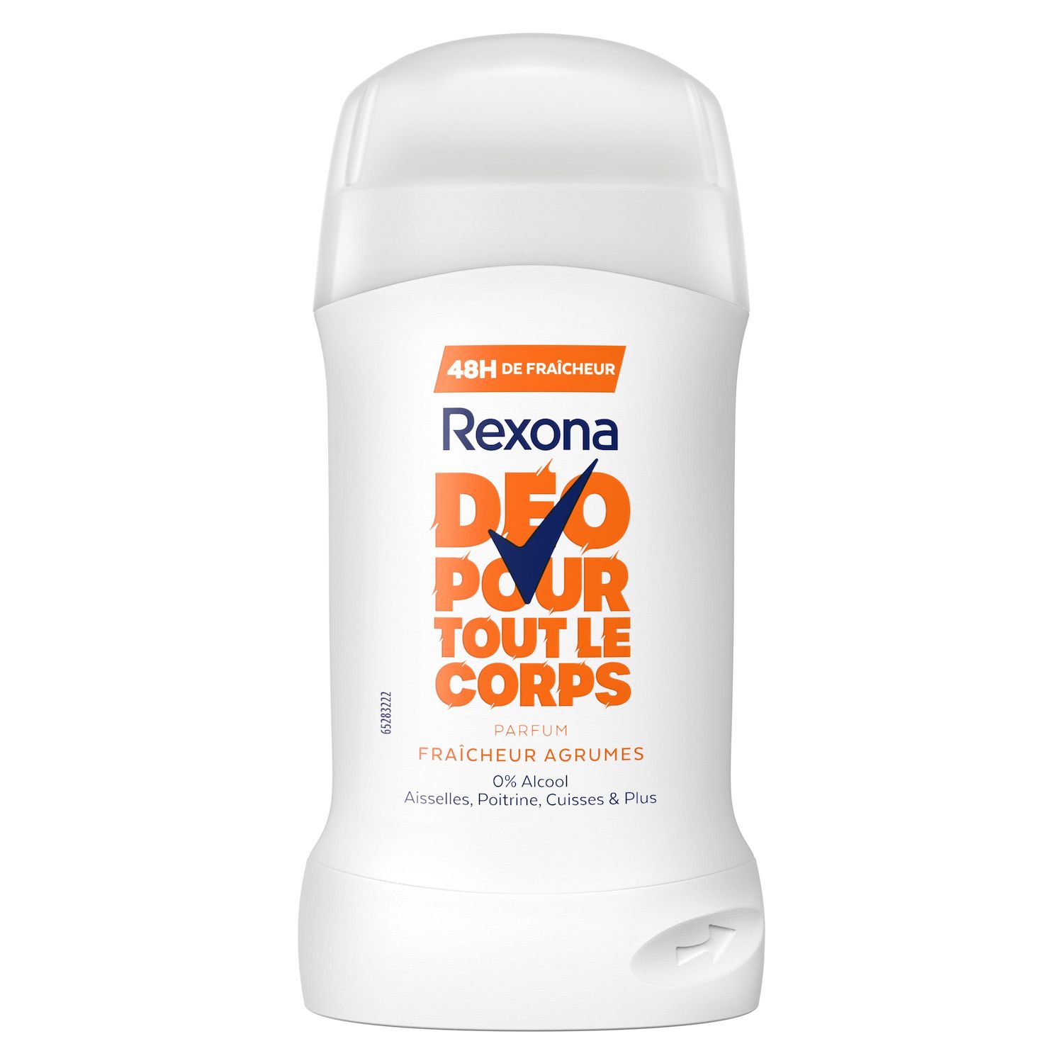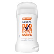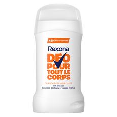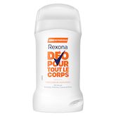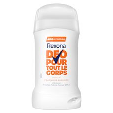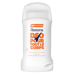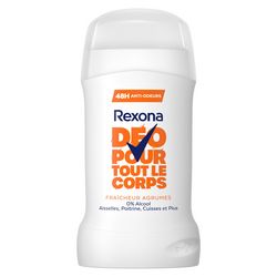 Dépassez vos limites et restez fraîche grâce au déodorant pour tout le corps Rexona fraîcheur agrumes. Ce déodorant stick sans alcool pour femme permet 48 heures de protection contre les odeurs. Il offre un parfum léger aux notes d'agrumes et une sensation de pure fraîcheur. Sa formule est anti-traces blanches et testée dermatologiquement. Ce stick glisse sur la peau pour une application facile. Utilisez-le partout où vous voulez lutter contre les odeurs : aisselles, poitrine, cuisses et plus. Testé sous contrôle gynécologique, ce stick peut être utilisé sur les parties intimes. Pour usage externe uniquement. Le saviez-vous ? Chaque partie de votre corps possède un microbiome unique. Le microbiome est la couche vivante protectrice de votre peau, constituée par des milliards de bactéries et de micro-organismes. Les mauvaises odeurs varient selon les parties de votre corps et leur microbiome. Le dédorant stick pour tout le corps Rexona vous offre une protection anti-odeur efficace sur les différentes parties de votre corps. Chez Rexona, nous voulons donner à chacune la confiance nécessaire pour bouger plus et toujours progresser. Nous sommes à vos côtés pour vous aider à repousser vos limites, puis à les dépasser. Notre déodorant corps sans alcool et anti-traces blanches vous permet de rester fraîche et en confiance. Rexona ne vous laissera pas tomber !