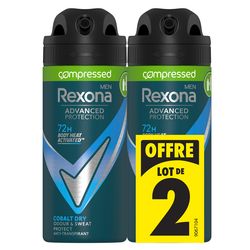 Gardez vos aisselles au sec avec l'anti-transpirant homme Rexona Men Advanced Protection Cobalt Dry. En plus de vous protéger pendant 72 h contre l'humidité et les odeurs, sa formule sans alcool laisse sur vos aisselles un parfum frais et masculin. Vous vous sentez frais et confiant pour la journée, prêt à vous dépasser et à donner le meilleur de vous-même ! L'emballage de ce déodorant spray anti-transpirant est majoritairement recyclable. Ce déodorant compressé spray anti-transpirant Rexona Men Advanced Protection Cobalt Dry a été fabriqué dans une usine utilisant 100 % d'électricité renouvelable. Jour après jour, les anti-transpirants Rexona Men vous protègent et apportent fraîcheur et confort à chacun de vos mouvements. Le déodorant anti-transpirant homme Rexona Men Advanced Protection Cobalt Dry vous est proposé au format de 2 x 100 ml. Le format compressé de cet anti-transpirant dure aussi longtemps qu'un aérosol classique de 200 ml. Les transpirants Rexona Men ne vous laisseront pas tomber. Escalader une montagne, prendre le bus, faire une présentation ou vous préparer pour votre premier rendez-vous : quoi qu'il arrive, vous pouvez compter sur l'efficacité Rexona. Nous nous appuyons sur notre longue expérience pour vous proposer des technologies anti-transpirantes exclusives, comme Body Heat Activated. Les molécules anti-transpirantes de la technologie brevetée Rexona s'organisent en un maillage serré pour réguler le flux de transpiration de façon ultra-efficace et vous offrent une haute performance durable. Rexona ne vous laissera jamais tomber. Technologie anti-transpirante brevetée et activée par la chaleur du corps pour 72 h de protection anti-transpirante. 72 h d'efficacité anti-humidité et anti-odeur non-stop. 0% alcool.