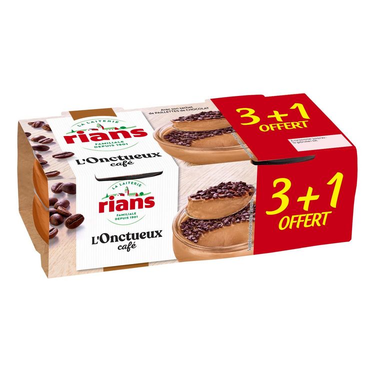 Ingrédients : ONCTUEUX : CRÈME*, LAIT* écrémé, ŒUFS, sucre, caramel [(sucre, eau), amidons], extrait de café 2,7%, jaunes d'ŒUFS. GARNITURE : chocolat en flocons 4,2% (sucre 58%, pâte de cacao 33%, poudre de cacao maigre 6,5%, matière grasse LAITIÈRE 2%, émulsifiant : lécithine (SOJA), arôme naturel de vanille). *Origine : France. LES ALLERGÈNES SONT INDIQUÉS EN GRAS.