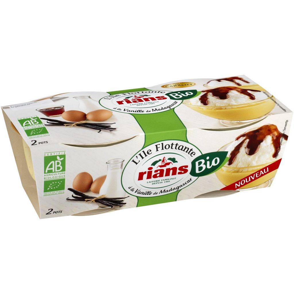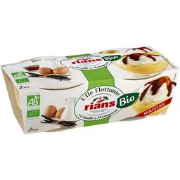 2 Iles flottantes bio . L'Ile Flottante à la Vanille de Madagascar Rians Bio est préparée selon la recette traditionnelle avec des ingrédients issus de l'agriculture biologique comme du lait entier, des œufs et du sucre. Ce dessert familial doit son succès à sa douceur, accentuée dans notre recette par la sélection de la vanille de Madagascar Bio au goût délicatement fruité. Raffiné, il vous surprendra par ses mélanges de textures : des oeufs à la neige mousseux et fondants, une crème anglaise onctueuse et rafraîchissante et un caramel coulant.