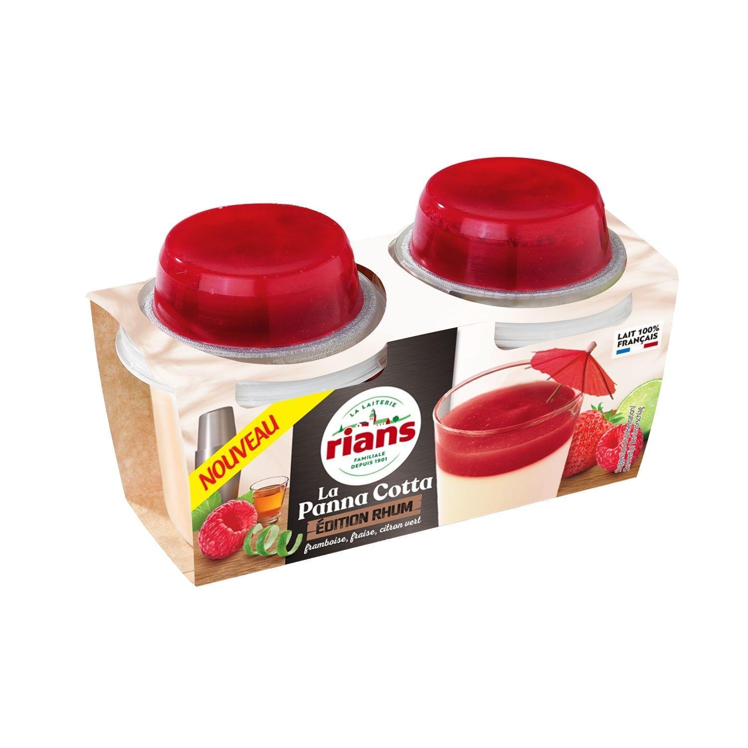 PANNA COTTA: ROOM*, magere MELK*, suiker, Guadeloupe rum 1,3%, gelatine. FRUIT COULIS: frambozenpuree 6,1%, suiker, aardbeienpuree 3,7%, limoencoulis 2,8%. *Oorsprong: Frankrijk. Percentages zijn gegeven voor het product als geheel (panna cotta + coulis). ALLERGENEN ZIJN VETGEDRUKT.