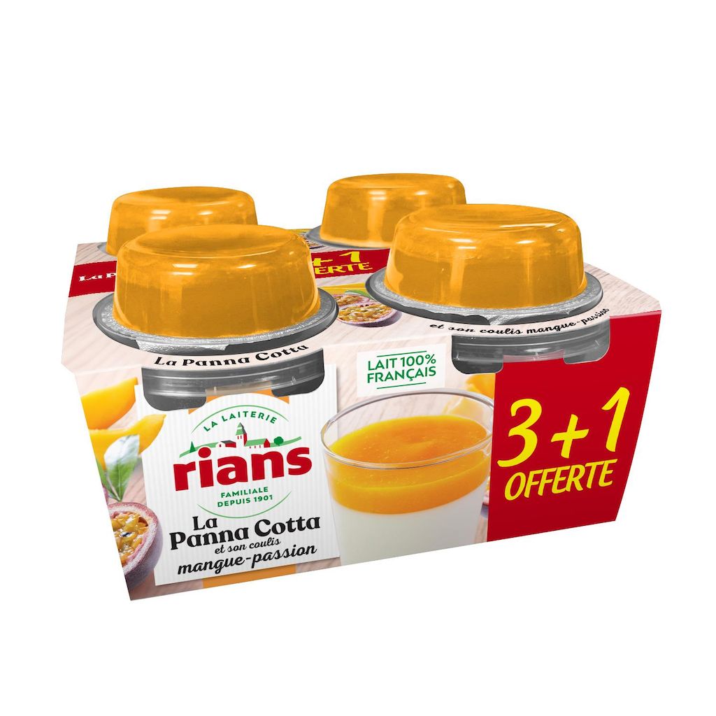 PANNA COTTA: ROOM*, magere MELK*, suiker, gelatine, natuurlijk aroma. COULIS MANGO - PASSIEVRUCHTEN: mangopulp 10,7%, suiker, passievruchtensap 1,9%. *Oorsprong: Frankrijk. De genoemde percentages zijn van toepassing op het hele product (panna cotta + coulis). DE ALLERGENEN ZIJN VETGEDRUKT.