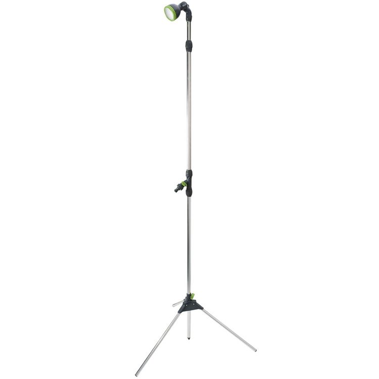Tube en alu démontable et réglable en hauteur. Le robinet se fixe sur un simple tuyau d'arrosage. Vanne marche/arrêt. Pomme de douche orientable. Les embouts en pointe du trépied permettent de l'enfoncer légèrement dans le sol pour le stabiliser.