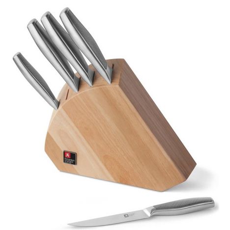 Richardson Sheffield 041001 Bloc de 5 couteaux Sense Richardson Sheffield 041001 composé d'un Bloc en bois d'hévéa et 5 couteaux inox dont Couteau Office, couteau utile, couteau à découper, couteau à pain et Couteau de cuisine. Les couteaux sont dotés des lames émoutes pour une coupe précise sans ef