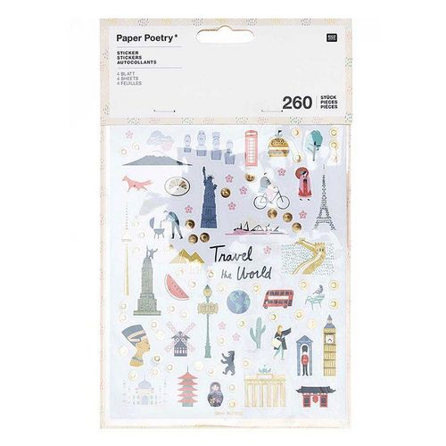 260 autocollants Monuments du Monde Personnalisez vos cartes, carnets, agendas et papiers cadeaux avec ces stickers sur le thème des monuments du monde ! Ces 260 autocollants de la marque Rico Design sont répartis sur 4 planches.