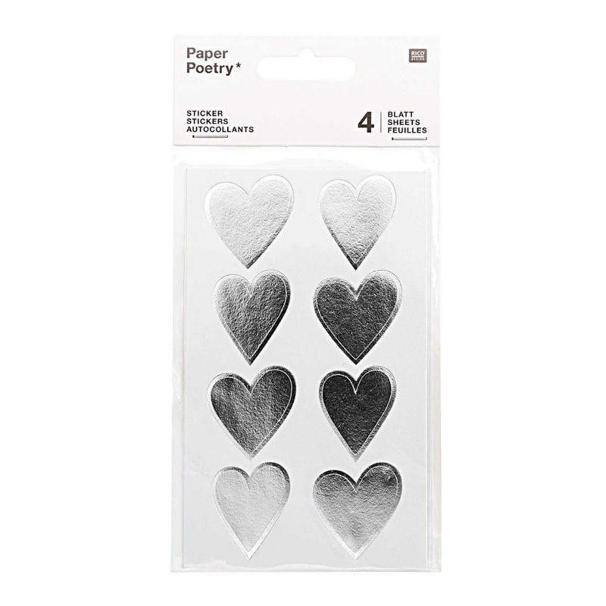 4 feuilles d'autocollants coeurs brillants argentés