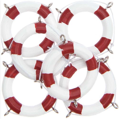 6 Décorations Bouées de sauvetage en bois - blanc et rouge