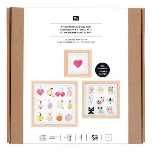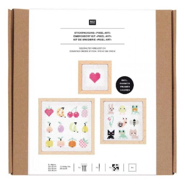 Avec ce kit de broderie, vous pouvez créer diverses images de broderie dans le style populaire pixel art. Le pack contient trois tissus à compter, du fil à broder, trois cercles à broder, une aiguille à broder et des instructions 3 x Cadres De?coratif Carre? S, M, L