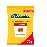 Les bonbons Ricola Original sans sucres sont à base du fameux mélange des 13 plantes des Alpes suisses, appréciées pour leur goût unique. L'Original sans sucres contient 5.1 mg de menthol par bonbon pour aider à apaiser la gorge*. * Le menthol contribue à apaiser la gorge, et ce, dès consommation d'un seul bonbon.
