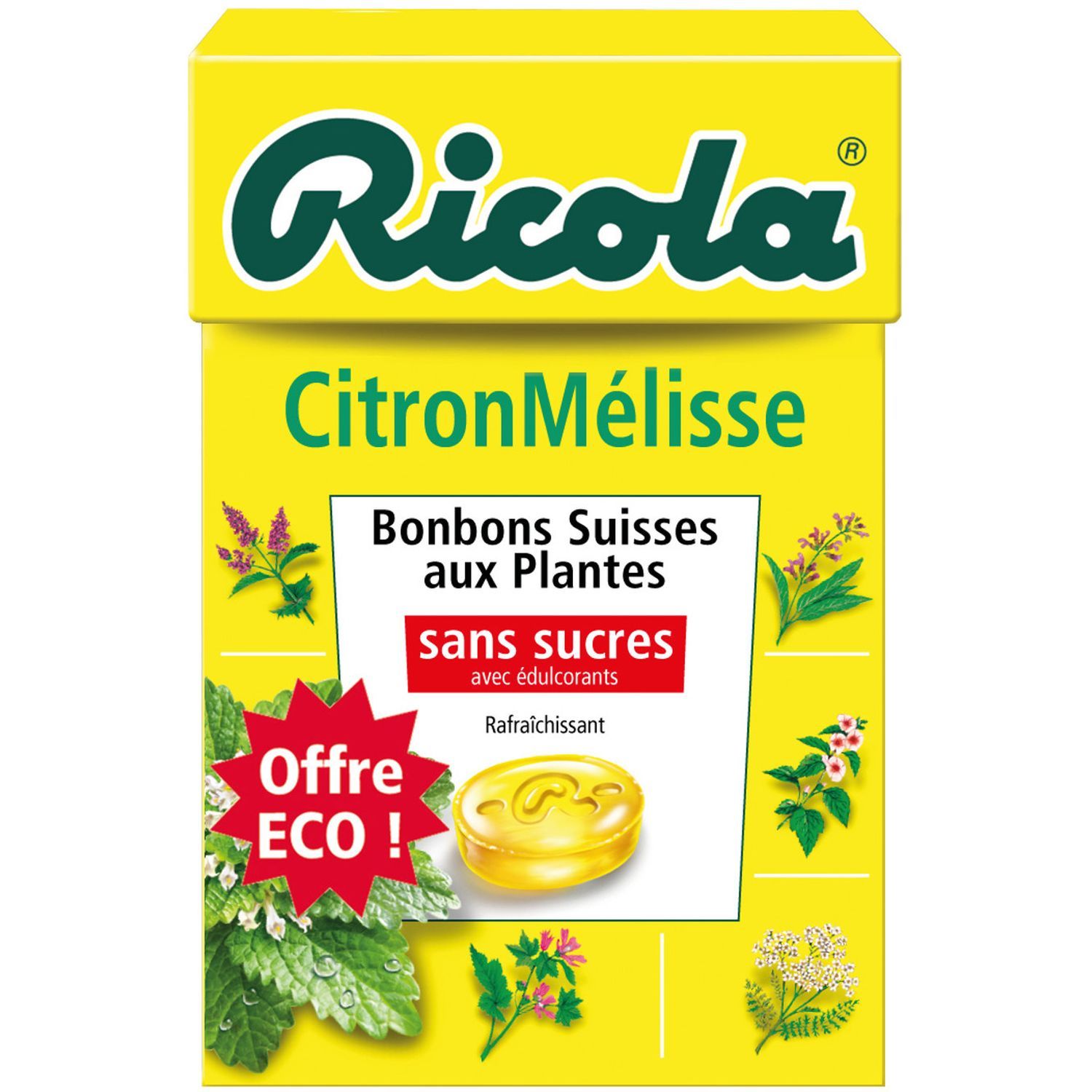 isomalt, acidifiant (acide citrique), extrait (0,3 %) de mélisse citronnelle et du mélange de 13 plantes Ricola, arôme naturel d’agrumes, édulcorants (sucralose, acésulfame-K), arôme naturel de menthes, menthol, colorant (caroténoïdes).