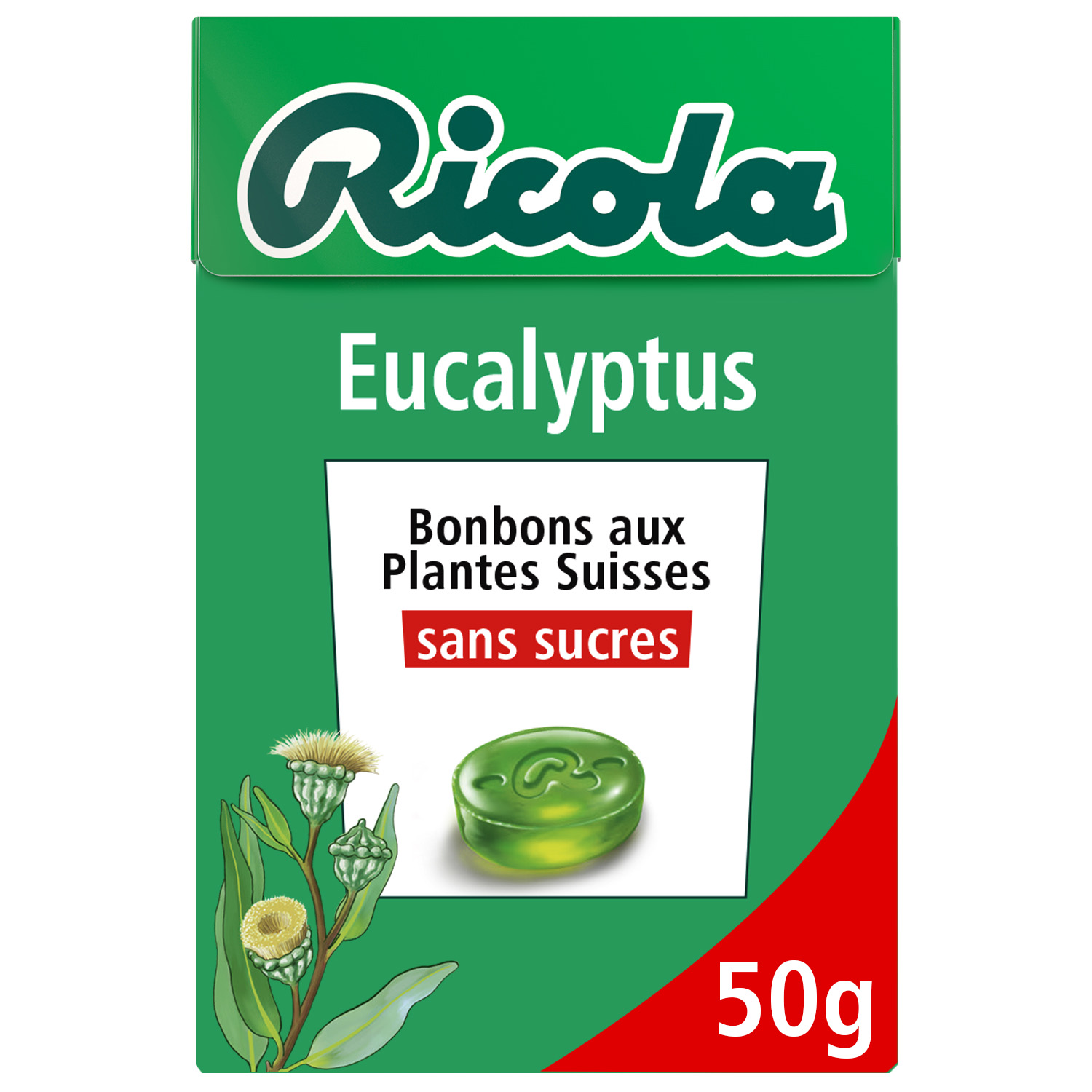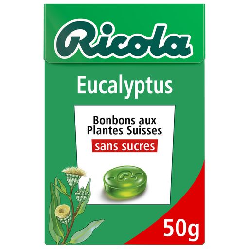 Bonbons suisses aux plantes, sans sucres. Rafraîchissant. Ricola Eucalyptus contient le fameux et délicieux mélange de 13 plantes des montagnes suisses. Eucalyptus Bonbons Suisses aux Plantes sans sucres avec édulcorants