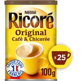 RICORÉ, le goût de la bonne humeur ! Découvrez le goût unique de la boisson chaude RICORÉ Original Café & Chicorée : l'alliance entre la force du café et la douceur de la chicorée. Le matin à la maison ou l'après-midi entre amis, il y a plein d'occasions pour savourer la boisson RICORÉ Original. En boîte de 100g, c'est le format pratique qui ne prend pas de place et que l'on peut essayer avant de l'adopter. Pour profiter d'une boisson délicieuse pleine de douceur préparez votre boisson RICORÉ Original avec 4g de poudre et 200ml de lait demi-écrémé chaud. Cette délicieuse boisson deviendra alors un véritable allié bien-être en participant aux apports recommandés en magnésium*. Vous allez adorer cette boisson chaude au goût unique et aux délicates notes de noisette ! Et avec toutes les recettes (RICORÉ Original, RICORÉ au Lait, RICORÉ Lait d'Amande ou RICORÉ Noir Intense), variez les plaisirs ! *Hors format sticks, apports de référence pour un adulte-type (8400kj / 2000 kcal).