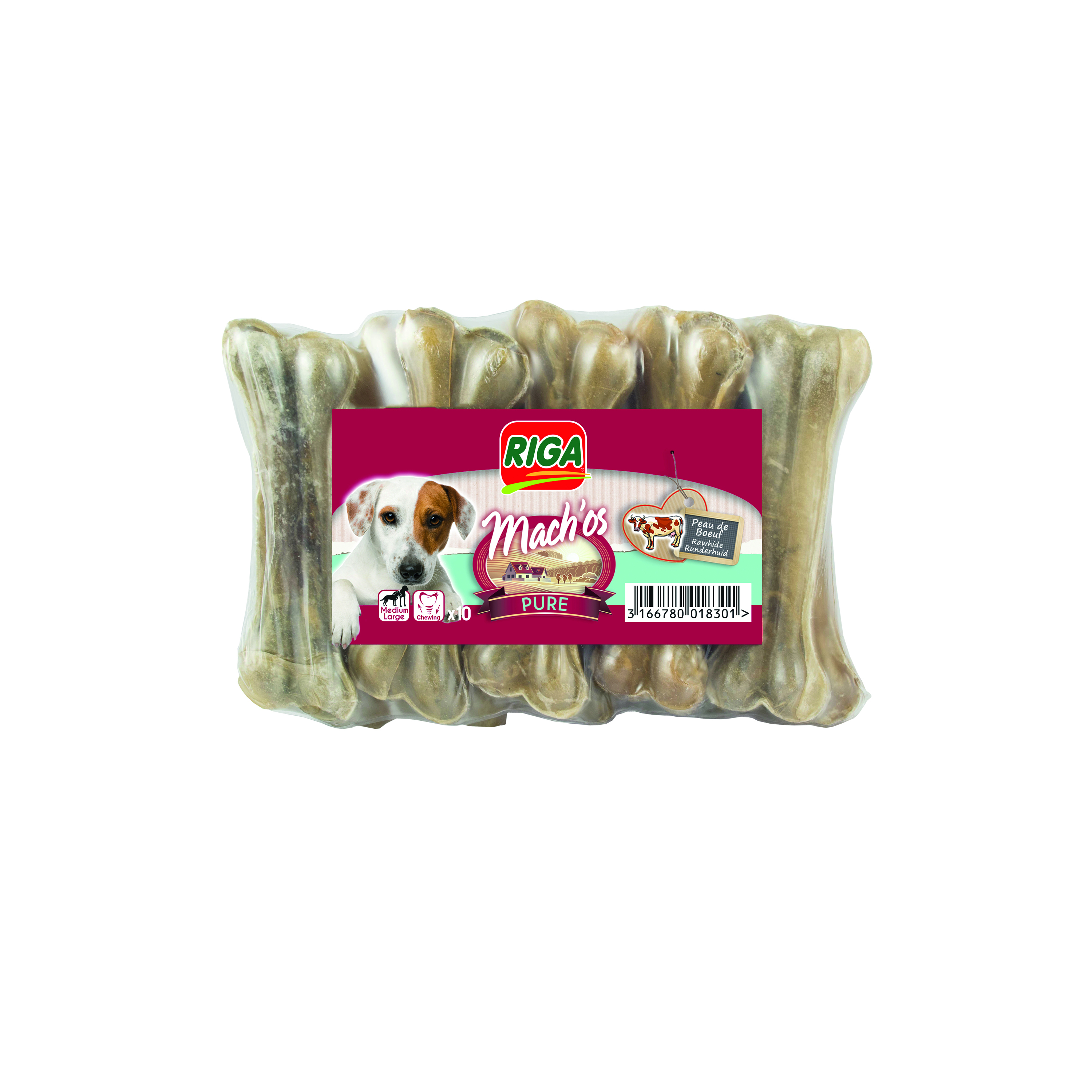 Les chiens ont par nature besoin de rogner et de mastiquer. MACH’OS PURE est fabriqué avec du cuir de bovin naturellement séché et sans l’apport d’additifs. Il constitue un très bon exercice pour les mâchoires et muscles masticateurs tout en étant un excellent passe-temps pour l’animal. Sous l’action de la mastication MACH’OS agit comme une brosse à dents contre la plaque dentaire et le tartre à l’origine de la mauvaise haleine. MACH’OS PURE est un article à mastiquer savoureux favorisant la mastication utile et prolongée. Ce produit n’est pas un aliment et ne doit pas remplacer une alimentation complète.