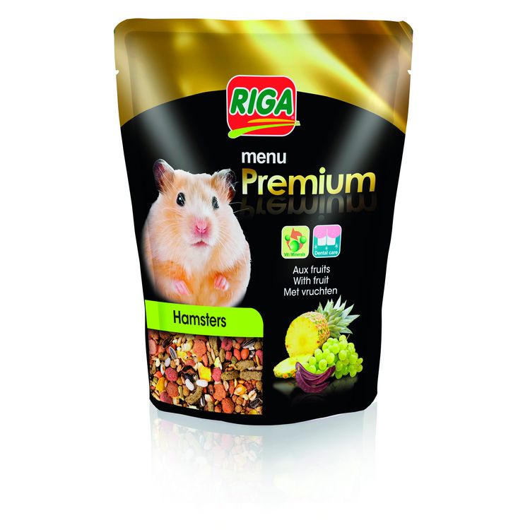 PREMIUM Menu Hamsters Vitamines et Fruits 500 g Aliment complet pour hamsters Ce menu PREMIUM, digeste et énergétique, est constitué de céréales soufflées et extrudées, de fruits et de légumes secs. Les ingrédients extrudés favorisent l’usure des dents de l’animal. Le supplément en vitamines favorise sa croissance et son tonus.