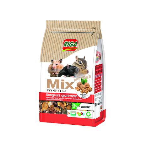 Ce menu vitaminé RIGAMIX répond à l’ensemble des besoins nutritionnels des rongeurs granivores (hamsters, rats, écureuils, souris, gerbilles). Ce mélange est composé de graines simples, soufflées, floconnées ou extrudées favorisant l’usure naturelle de leurs dents. Les granulés extrudés évitent le comportement de tri sélectif ainsi que le développement de carences.