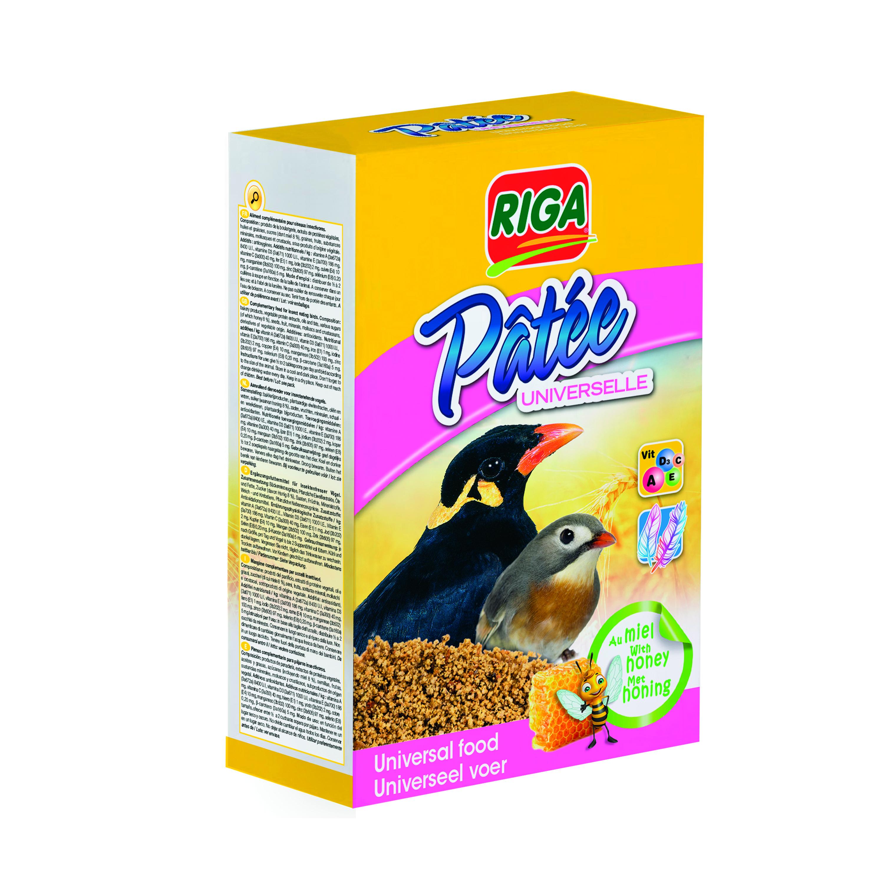 La pâtée universelle contient tous les éléments indispensables à l'équilibre alimentaire des oiseaux insectivores à bec fin. Cet aliment énergétique convient aux oiseaux jeunes et adultes. Cette pâtée, prête à l'emploi, est particulièrement appréciée des oiseaux comme les rossignols du Japon, les mainates et les oiseaux exotiques ainsi que des oiseaux de la nature : merles, grives, sansonnets, alouettes, geais etc... Elle leur assure la forme et la vitalité. Elle favorise le chant et donne un plumage brillant, fourni et coloré.