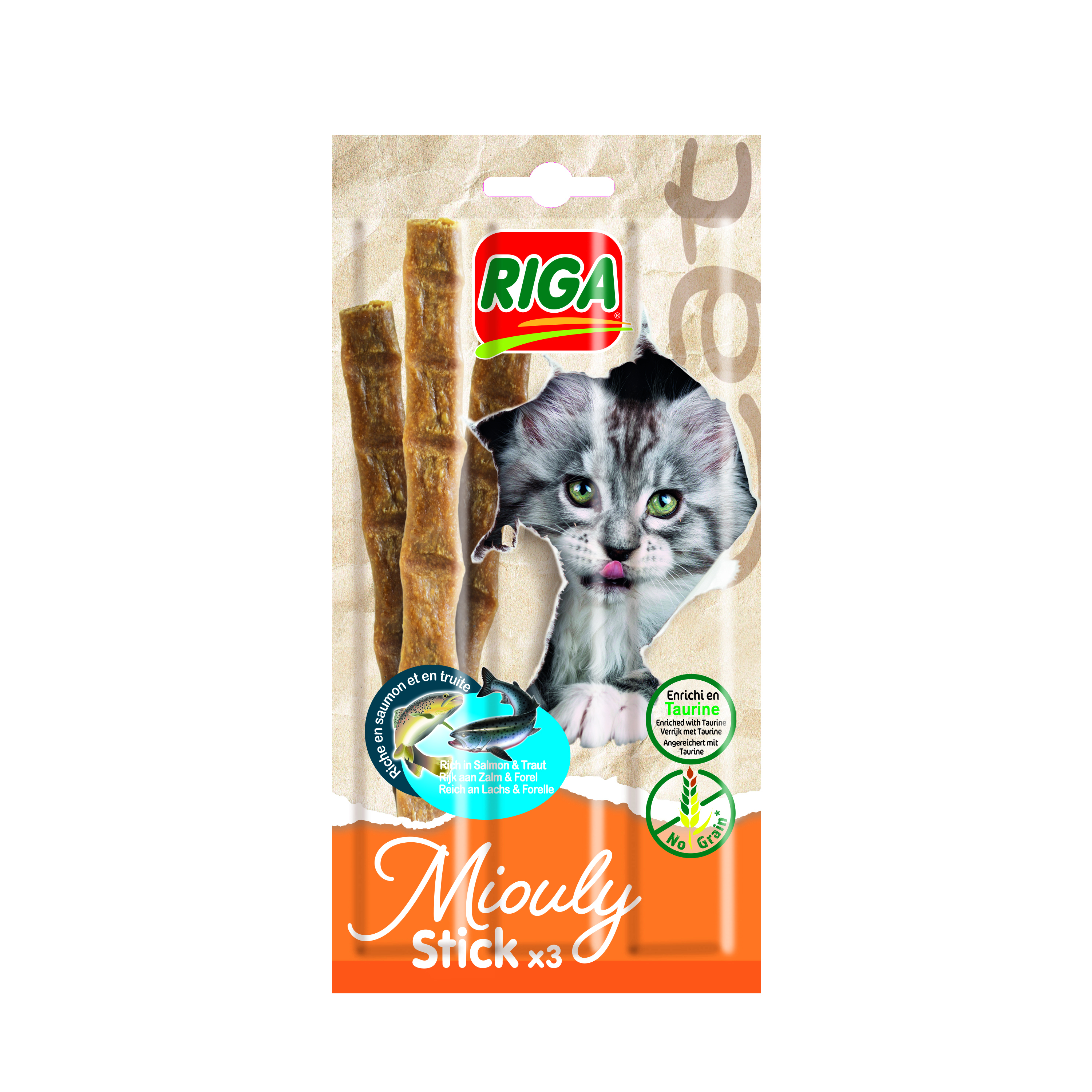 Nos Miouly Stick sont de savoureuses friandises, sans céréales, au saumon et à la truite. Enrichies en Taurine, cet acide aminé est indispensable au bon fonctionnement du métabolisme du chat et améliore la digestion.