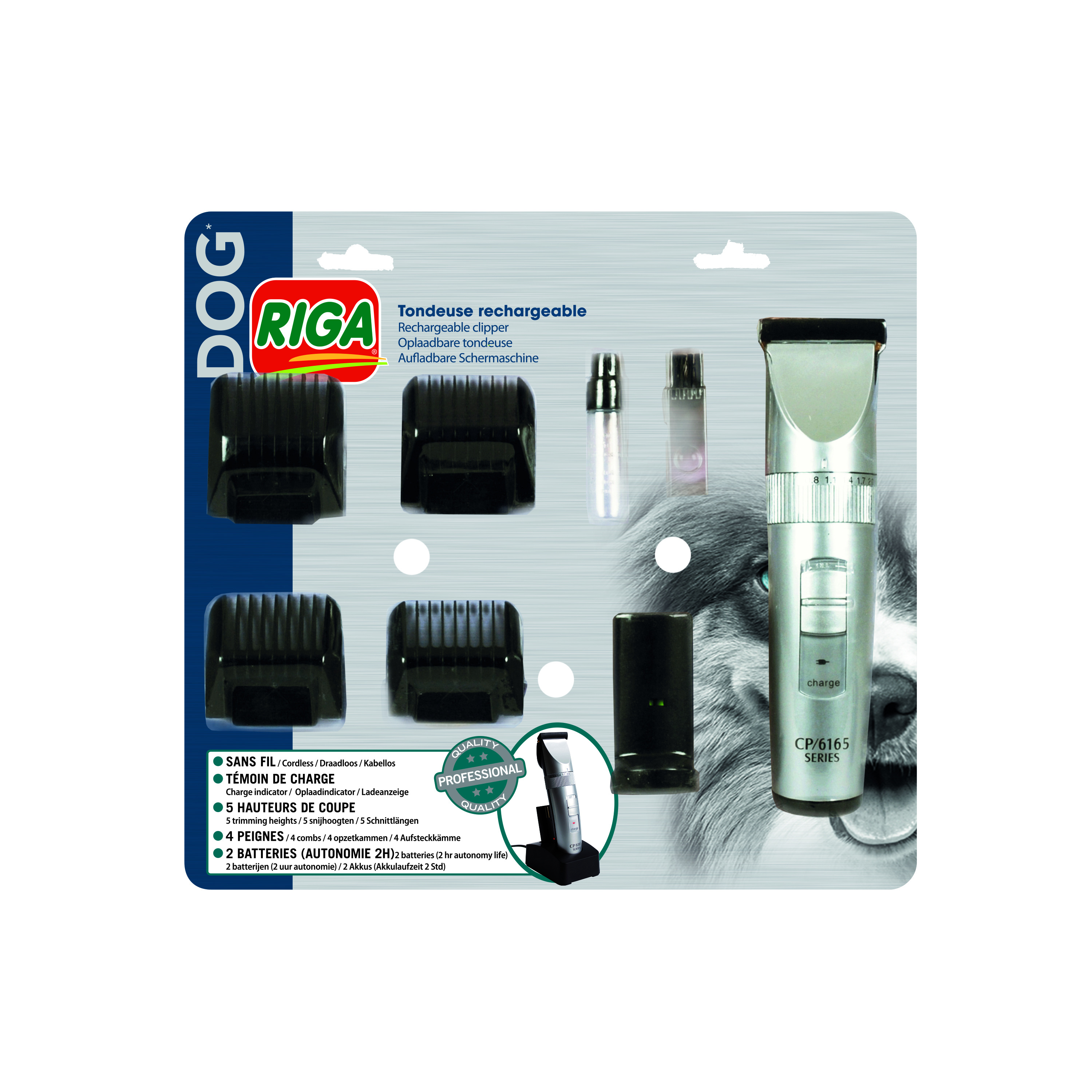 Cette tondeuse professionnelle est destinée à une utilisation pour les animaux. Tondeuse sans fil équipée de 2 batteries possède une autonomie de 2h. L’appareil peut alors fonctionner avec les batteries rechargeables ou avec l’adaptateur. Elle permet d'avoir 5 hauteurs de coupe. Elle est également disponible avec 4 peignes.