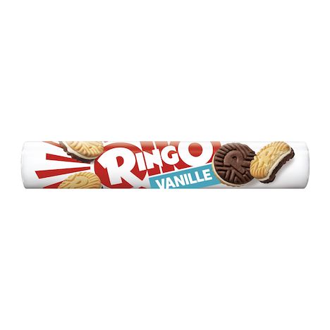 Biscuit (73%): farine de BLE, sucre, huile de tournesol, amidon de BLE, cacao maigre 1,8%*, sirop de glucose, lactosérum (LAIT) en poudre, sel, poudres à lever (carbonate acide de sodium, carbonate acide d'ammonium), arôme vanilline 0,03%. Garniture (27%): graisses et huiles végétales non hydrogénées (cacao, tournesol), sucre, dextrose, lactosérum (LAIT) en poudre, amidon de BLE, arôme vanilline 0,01%.