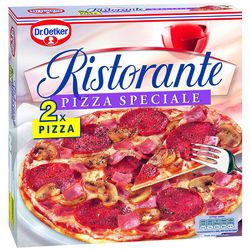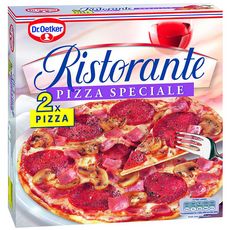 Savourez la pizza Ristorante Speciale. Sa pâte fine et croustillante est généreusement garnie de jambon, de délicates tranches de salami et de champignons. Une recette originale qui change de la traditionnelle pizza italienne !