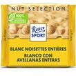 Chocolat blanc aux noisettes entières grillées (25%) et riz soufflé (3%).