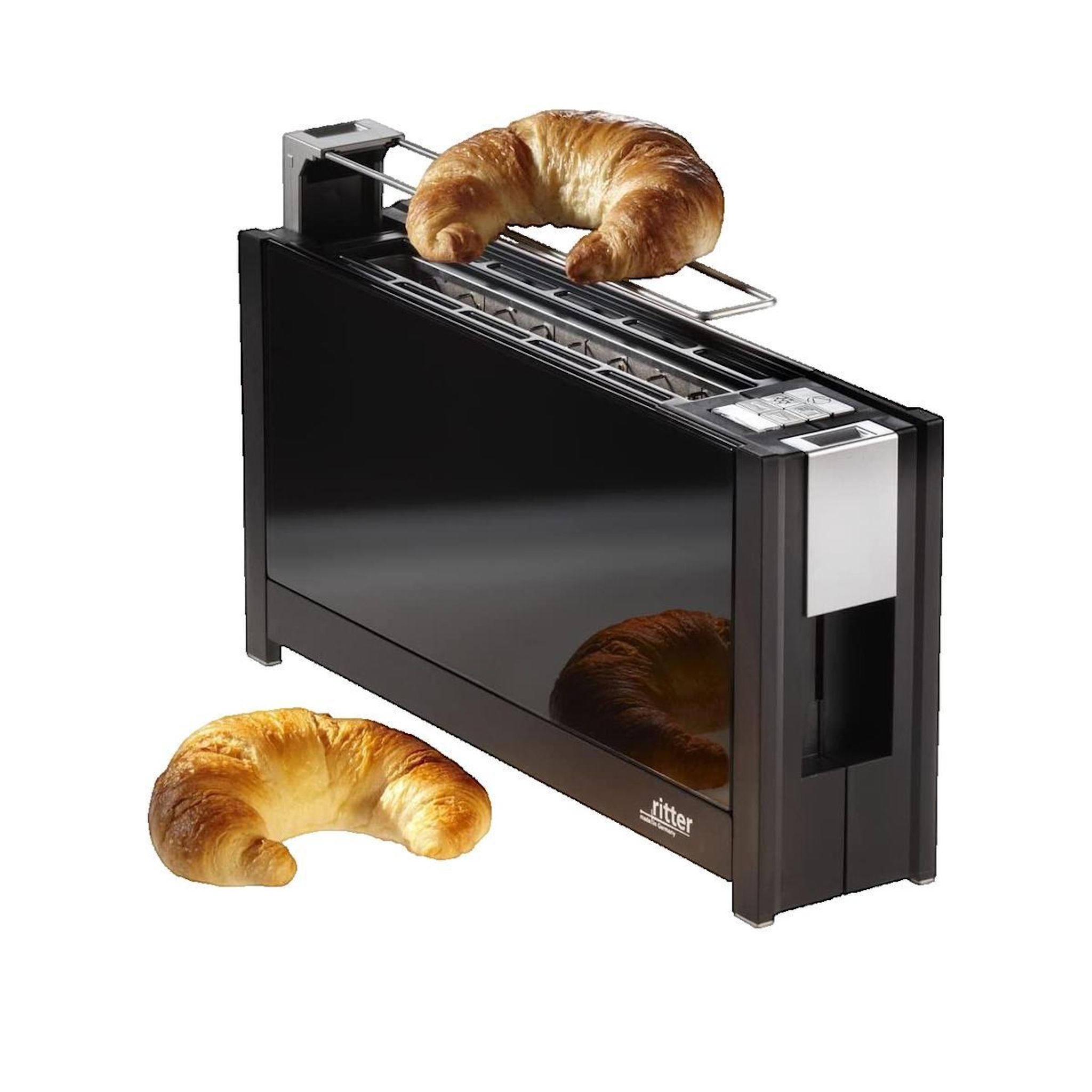 Le grille-pain électrique Ritter Volcano 5 est idéal pour vos besoins en cuisine. Il permet de toaster deux tranches de pain simultanément et offre des fonctions de décongélation, de réchauffage ainsi qu'un arrêt sécurisé pour une utilisation simple et sûre. Doté d'un boîtier en verre au design mode