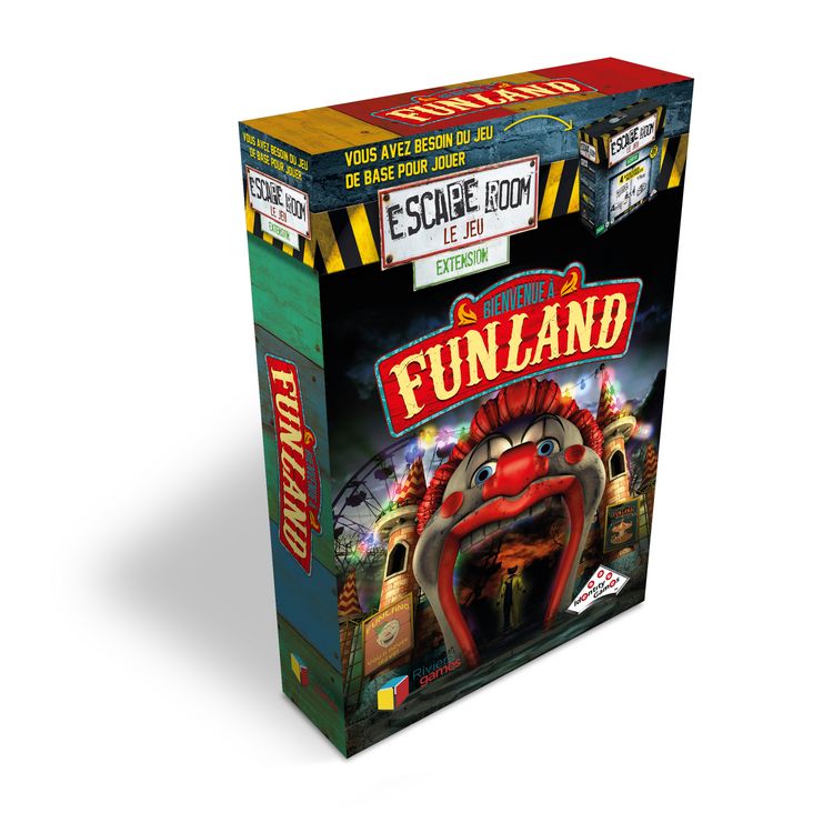 Extension pour le coffret 4 jeux Escape Room Le Jeu.Voici une nouvelle aventure inédite : Funland. Un vieux parc d'attraction, un clown douteux, vous auriez mieux fait de refuser ces tickets gratuits...Durée d'une partie : 60 minutes.Nombre de joueurs : de 3 à 5.A partir de 16 ans Age minimum : 15 ans