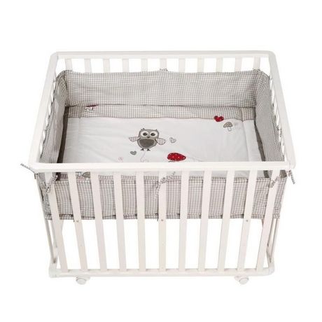 Ce parc bébé ROBA en bois laqué blanc (100x75 cm) allie esthétique moderne et sécurité certifiée. Son insert textile rembourré Adam et Eule imprimé chouette apporte douceur et stimulation visuelle, tandis que les barres plates et le tour de lit intégré garantissent une protection optimale contre les chocs.