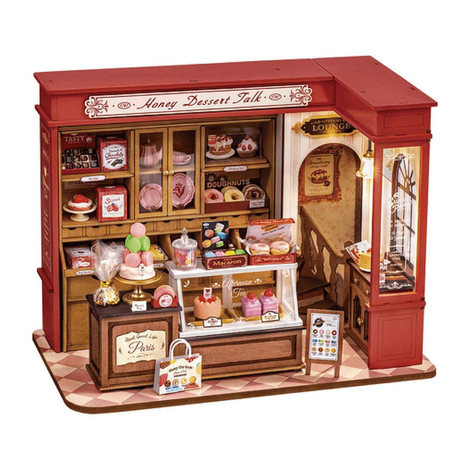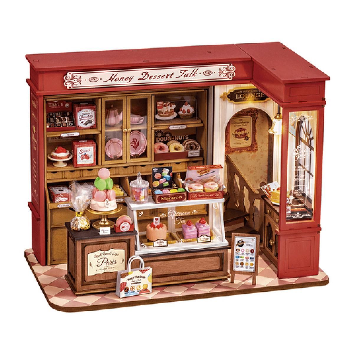 C'est l'heure des gourmandises de Honey Dessert Talk, une pâtisserie française sucrée et élégante de Rolife. Cette miniature à réaliser soi-même regorge de créations délicieuses, présentées avec art dans de charmantes vitrines et des étagères en bois. Ajoutez cet adorable modèle à votre collection de maisons miniatures dès aujourd'hui !. Savourez une douceur de vivre dans cette pâtisserie française de rêve. Elle réunit tous les atouts d'un pâtissier : créations sucrées, étagères en bois, vitrine, comptoir et même un espace repas à la lumière chaleureuse. Chaque plateau regorge de délices variés : macarons, shortcakes, biscuits au beurre, petits pains, chocolats et beignets. Des bonbons gélifiés sont servis dans le bocal à bonbons et la porcelaine délicate est idéale pour accompagner un thé ou un café. Il ne manque plus que vous et votre touche créative. Disposez et présentez vos gourmandises selon vos goûts. Créez un havre de paix pour vos clients en emballant et en mettant en boîte des gourmandises qu'ils pourront emporter chez eux, partager et savourer. Tout est là chez Rolife Honey Dessert Talk, une création sucrée et concrète à exposer aux yeux des autres !