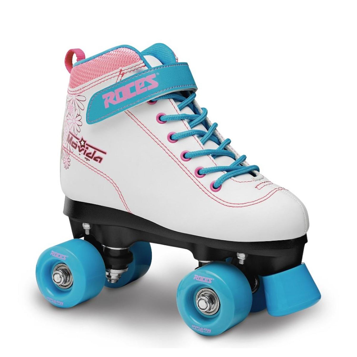 Chaussure : soft en vinyl, semelle extérieure PVC injecté et bords PE, semelle intérieure anatomique. Fermeture : lacet et strap velcro. Truck : fibre. Platine : fibre. Frein : PU. Roue(s) : PU 54x32mm 85A. Roulements : abec 7