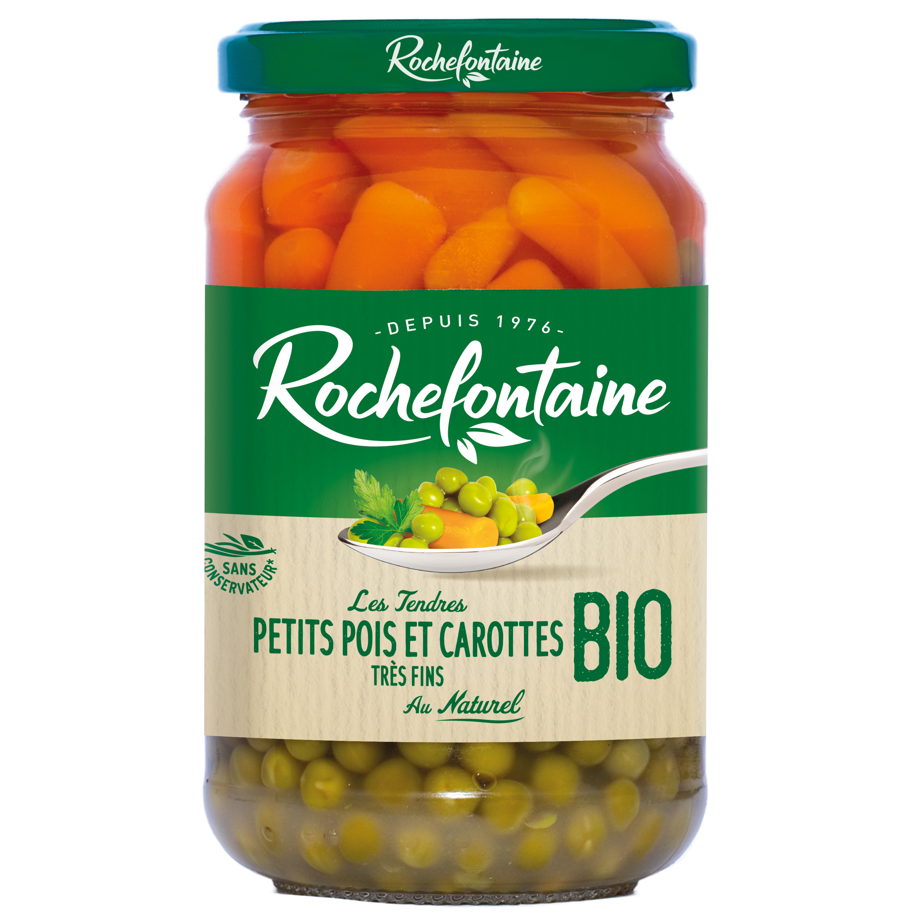 Petits pois* très fins (50% mini), jeunes carottes* (30% mini), eau, sucre de canne* non raffiné, sel de mer, oignon* poudre, échalote* poudre. *Issu de l’agriculture biologique.