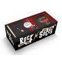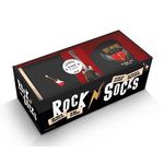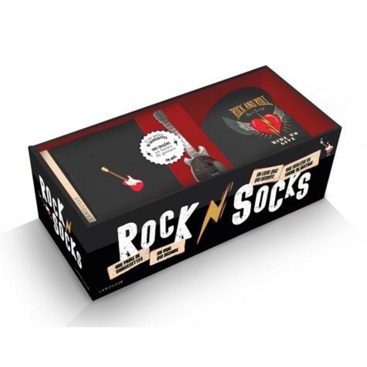 ROCK & SOCKS ! COFFRET AVEC 1 MUG EN CERAMIQUE, 1 CUILLERE EN FORME DE GUITARE ELECTRIQUE, 1 PAIRE DE CHAUSSETTES ET 1 LIVRET DE 100 QUESTIONS SUR LES GROUPES DE ROCK MYTHIQUES, Larousse